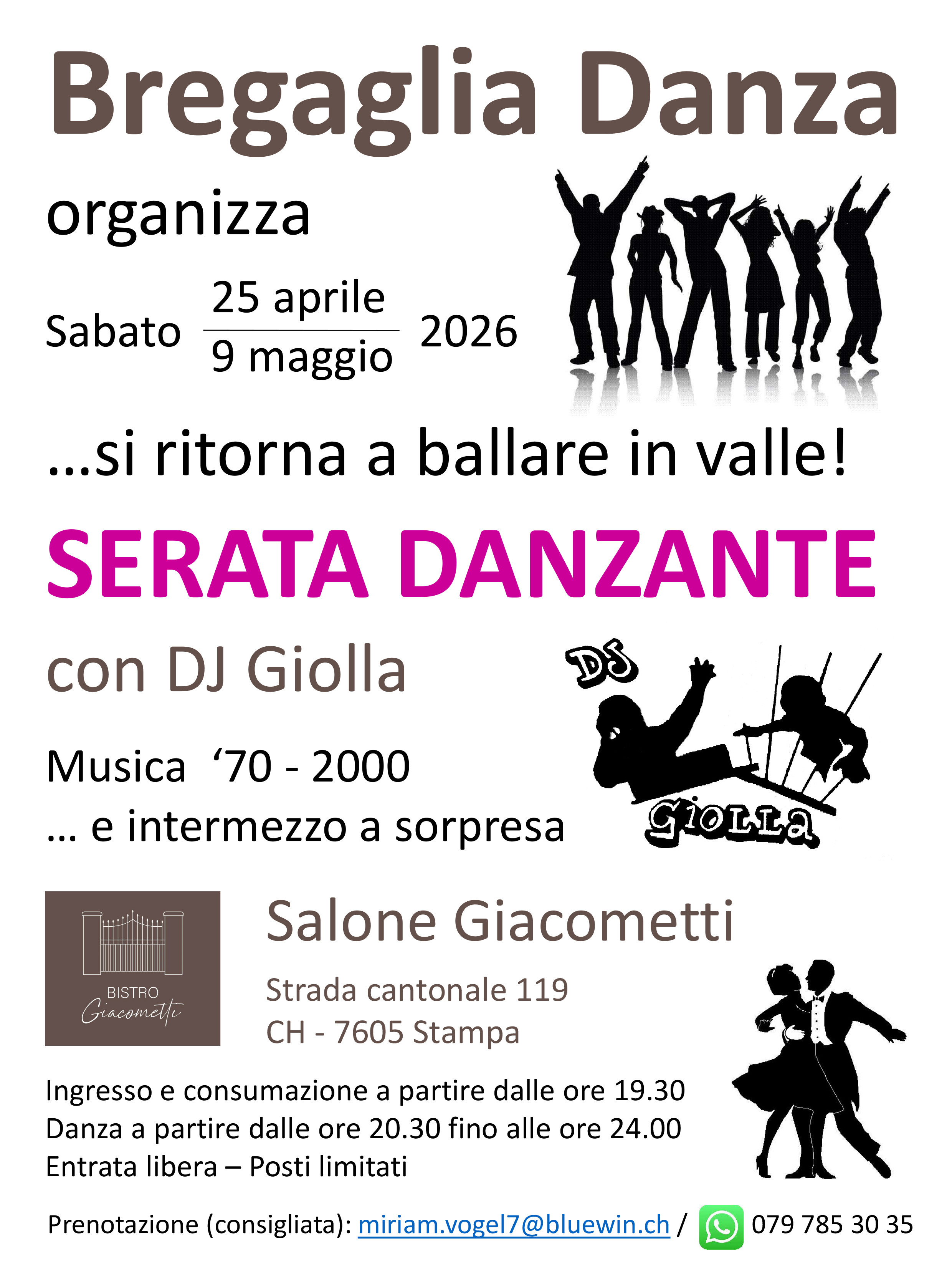 Se hai una particolare canzone che vuoi sentire o ballare oppure se vuoi prenotare un posto, basta contattare Miriam Vogel: E-mail: miriam.vogel7@bluewin.ch o WhatsApp: 079 785 30 35.