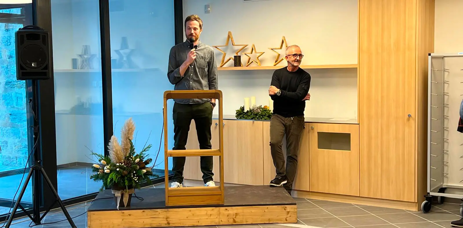 Per le solette abbiamo utilizzato uno strato di 12 cm di legno e uno strato di 10 cm di calcestruzzo armato e la struttura portante è leggermente sovradimensionata, così da garantire la sicurezza richiesta. Rispetto all'acciaio che, in caso di incendio cola prima e collassa poi, il legno ha un deperimento graduale che consente di intervenire prima e meglio. La facciata esterna dell'edificio è stata pensata di colore nero per ridurre l'impatto visivo anche da uno sguardo lontano; per integrarsi meglio nel paesaggio.