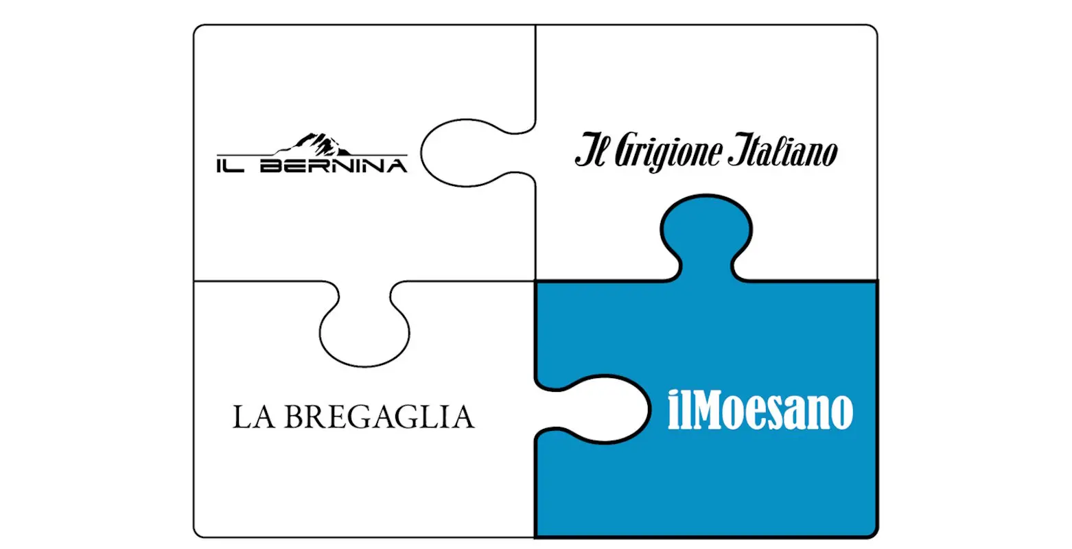Quattro pezzi di puzzle con testi. Il pezzo in alto a sinistra riporta "Il Bernina", quello in alto a destra "Il Grigione Italiano", in basso a