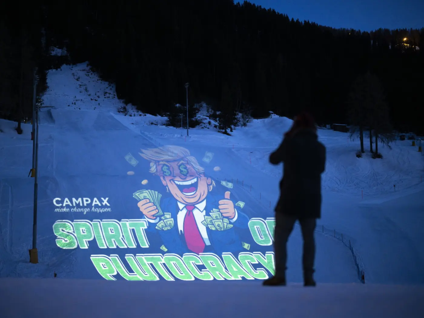 La proiezione, illegale, mostrava Donald Trump con banconote in mano e negli occhi, accompagnata dal testo "lo spirito della plutocrazia", per ridicolizzare il motto del forum economico mondiale (WEF), "lo spirito del dialogo".