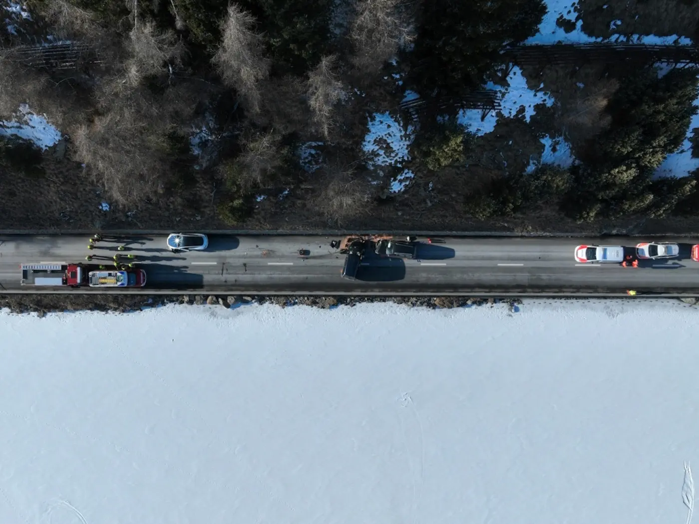 Il luogo dell'incidente e l'intervento dei mezzi di soccorso e della polizia ripresi da un drone. A seguito dello scontro la strada fra Maloja e Silvaplana è rimasta chiusa per due ore.