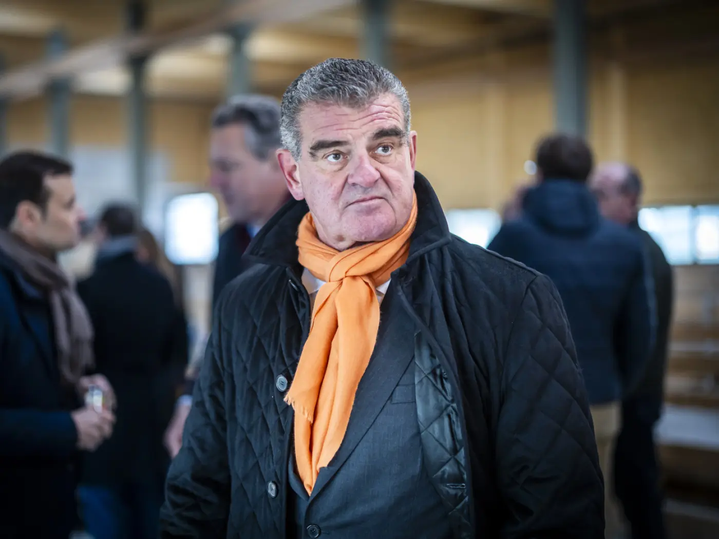 Uomo con sciarpa arancione in un ambiente affollato. Indossa un cappotto scuro e sembra pensieroso mentre osserva intorno a sé.