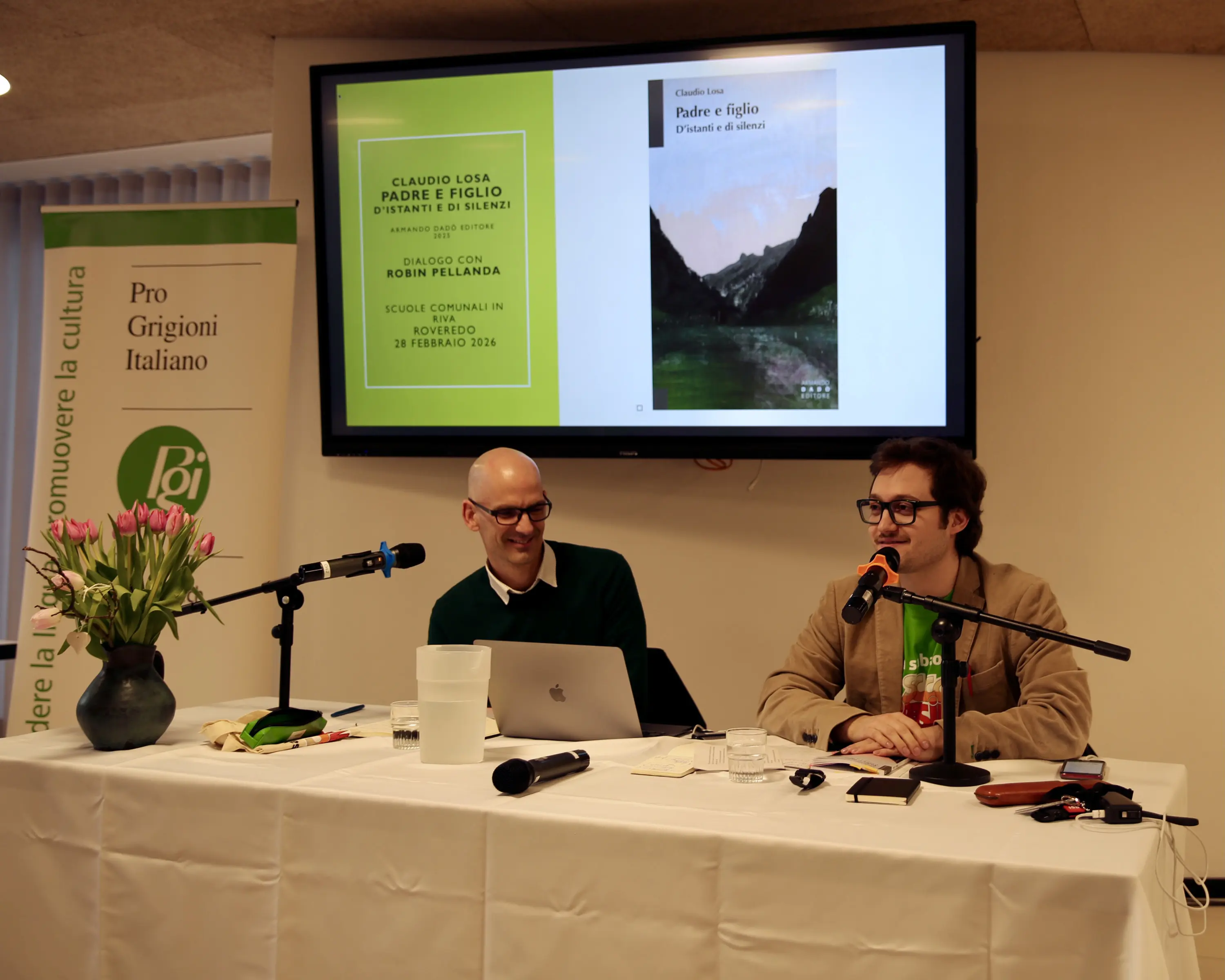 Il volume è stato presentato dall’autore a colloquio con Robin Pellanda il 28 febbraio 2026 nell’Aula Magna della Scuola comunale “In Riva” a Roveredo, durante una serata organizzata alla presenza di un folto pubblico dalla Pro Grigioni Italiano in collaborazione con il Comune di Roveredo.