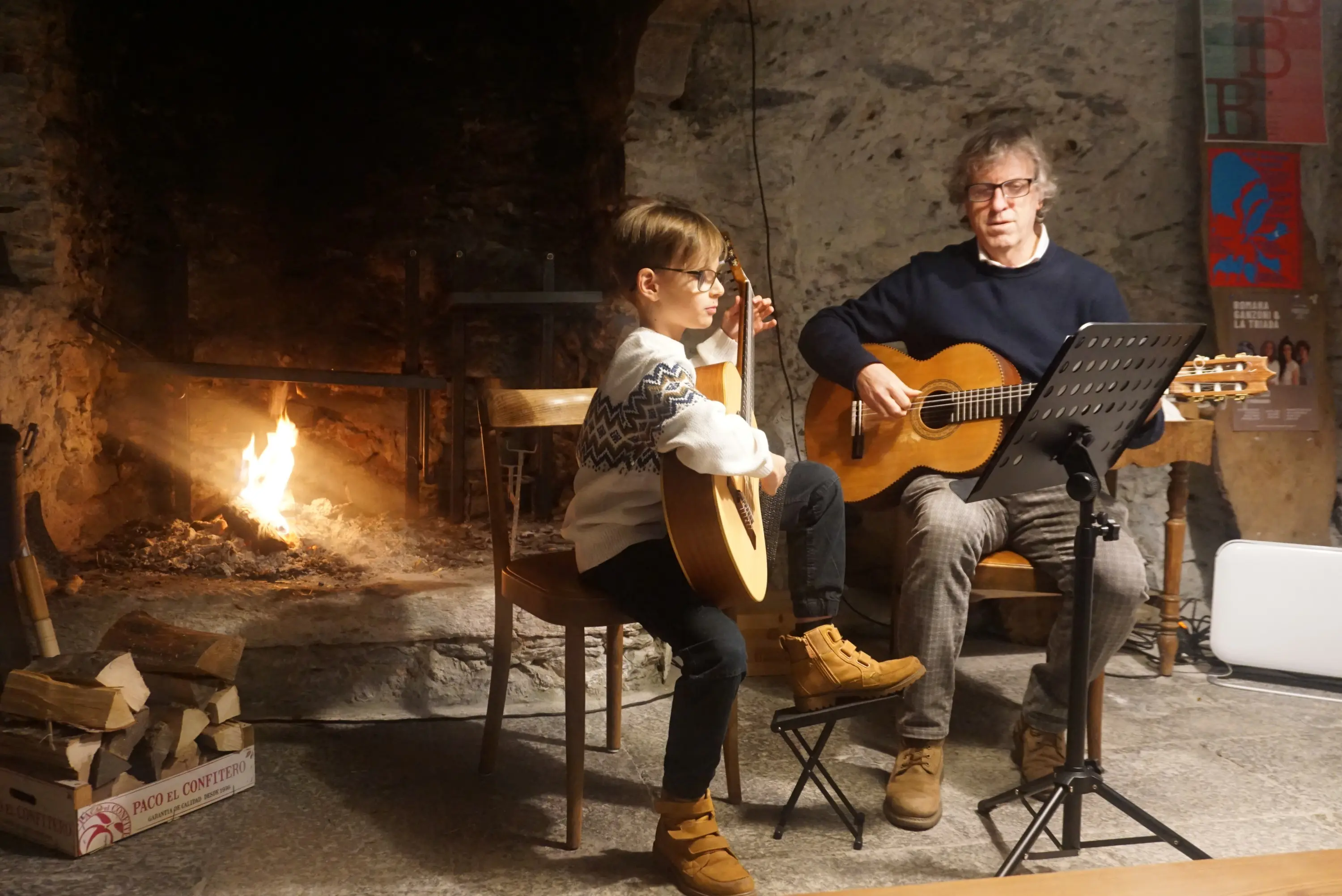 Al piano terra in un ambiente caldo, anche per la presenza di un grande camino, si sono esibiti Rachele Viganò al violino, Ida Gredig chitarra e voce, Edoardo Wazzau chitarra e voce e Teresa Giovanoli anche lei chitarra e voce.