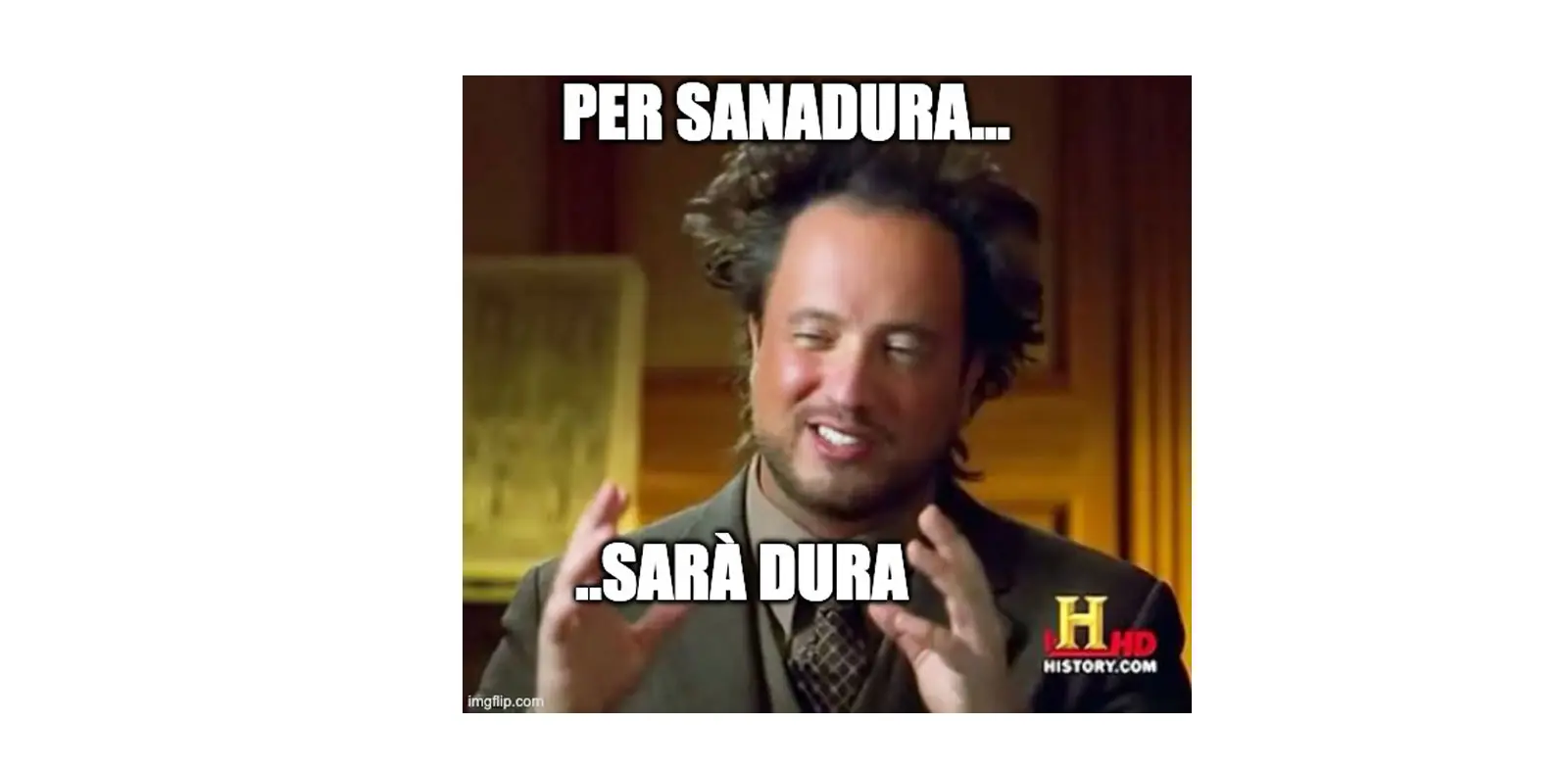 Un uomo con i capelli ricci e disordinati parla, esprimendo entusiasmo; il testo sopra recita: "Per sanatura... sarà dura."